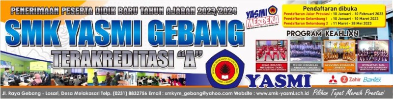 SMK YASMI Gebang merupakan sekolah menengah kejuruan di naungi oleh lembaga Yayasan Martha Indonesia yang bergerak dibidang pendidikan.SMK YASMI Gebang memilki 3 program keahlian diantaranya: Ketiga program keahlian diatas terakreditasi “A”, SMK YASMI Gebang juga termasuk kedalam sekolah pilot project kurikulum 2013 yang ditunjuk oleh Kementrian Pendidikan dan sebagai sekolah percontohan atau rujukan. SMK YASMI Gebang juga merupakan sekolah yang disiplin dan membentuk karakter kepribadian peserta didik yang tangguh. PERSYARATAN PENDAFTARAN