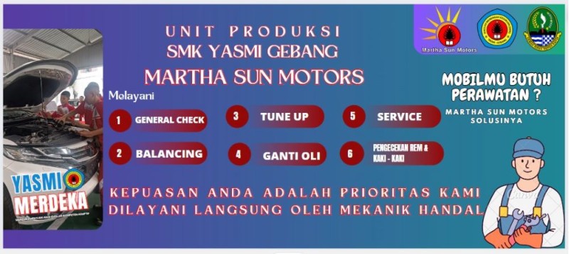 Berdasarkan pemaparan diatas SMK Yasmi Gebang dengan sadar dan usaha yang keras akan menyelenggarakan program unit produksi dengan oreintasi sesuai dengan program keahlian yang ada yaitu Teknik Kendaraan Ringan Otomotif sebagai center unit produksi dibidang jasa servis kendaraan ringan, pelayanaan prima untuk jurusan OTKP dan pembukuan hasil unit produksi jurusan AKL. Adapun unit produksi SMK Yasmi Gebang adalah Martha Sun Motors
