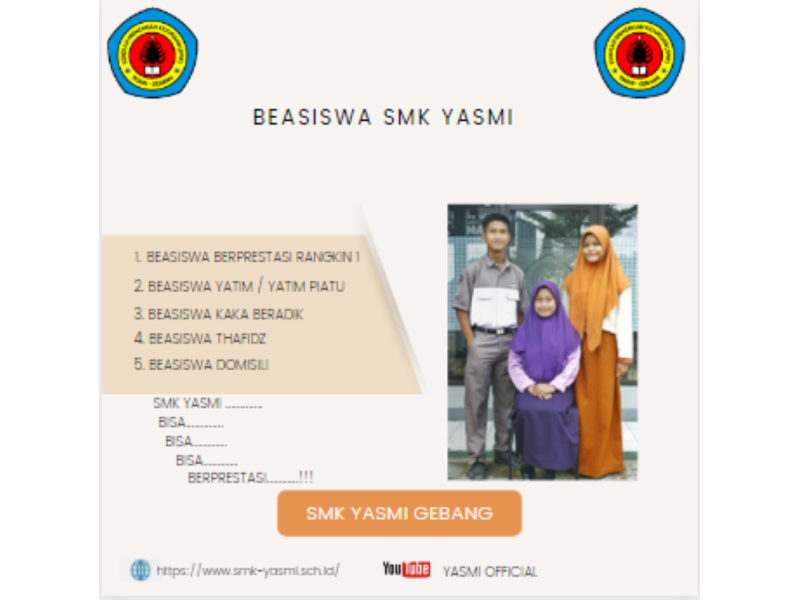 Assalamualaikum....... inggin mendapatkan Beasiswa seperti di atas ayo bergabng di SMK YASMI GEBANG dan Bagi yang ingin bergabung silahkan langsung saja klik PPDB SMK YASMI GEBANG dan lanjutkan pendaftaran nya terimakasih....